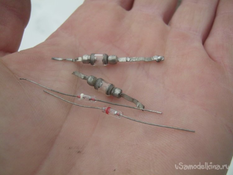 Фото 10. Детектор-диод фабричной выделки, обязательно германиевый. Здесь Д9 (помельче) и Д2 (покрупнее). Проверил тестером при прямом-обратном включении. Цветной полоской у Д9 помечен (в отличии от современных импортных) анод. Катод – кристалл внутри в который упирается остриё проволочки-пружинки. Кроме того, у Д9 проволочный вывод катода толще, а у Д2 полярность выбита на плоском выводе.