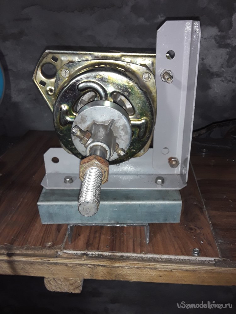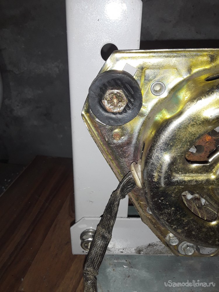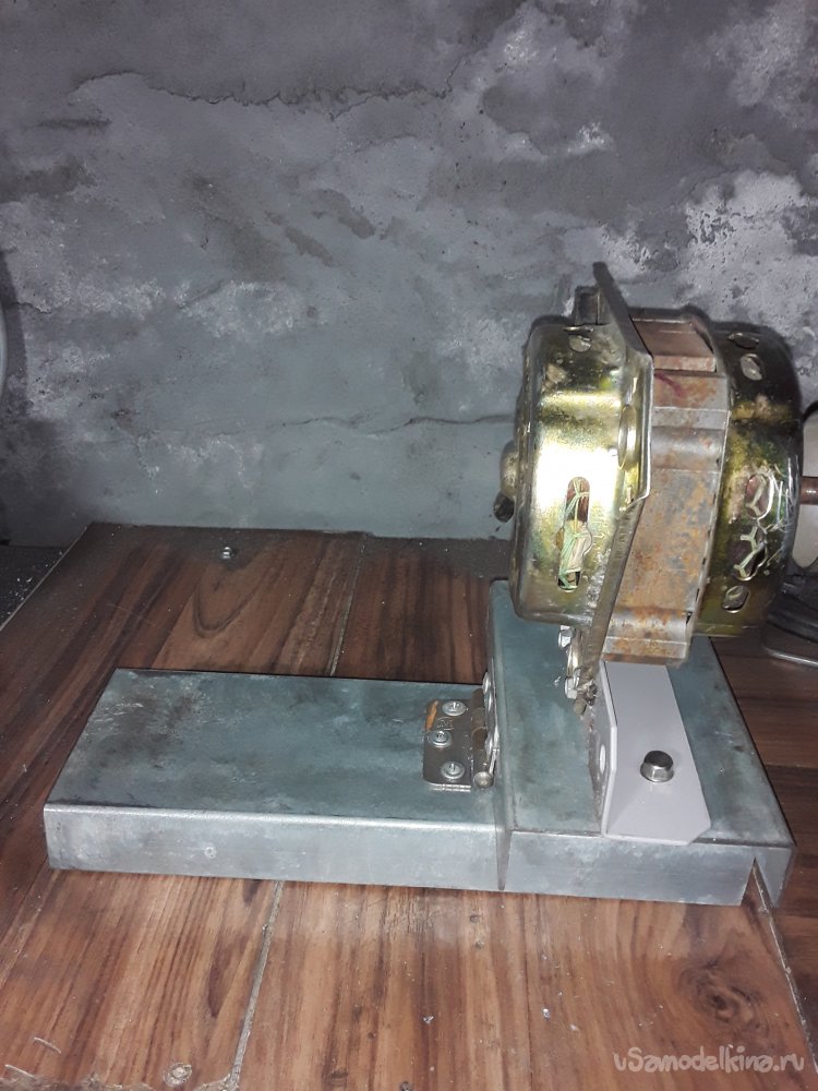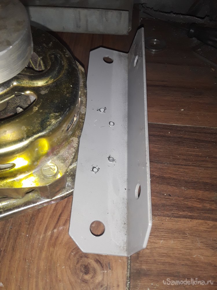 Переходная муфта на двигателе уже была диаметр на валу двигателя 8мм, а вал для крепления 12мм. Так как двигатель китайский и не разборный у него за годы работы появился немного люфт, но не значительный если далее биение появится и будет нетерпимым то я разберу двигатель рассверлив заклепки и вместо китайских шариковых втулок поставлю обычные подшипники и двигатель будет как новый и станет ремонтно пригодным. И так для крепления двигателя я взял кусок 20см уголка 50мм на 50мм толщиной 3мм сделал разметку и прикрутил на саморезы по металлу такой крепеж очень даже крепкий. Для крепления двигателя взял от кабеля канал п образный профиль толщенной 2мм сделал разметку и просверлил отверстия в профиле и уголке в тех местах, где двигатель будет крепиться на родные уши корпуса. И закрепил уголок к профилю на два болта м8 с граверами все держится как нужно и ничего не болтается.