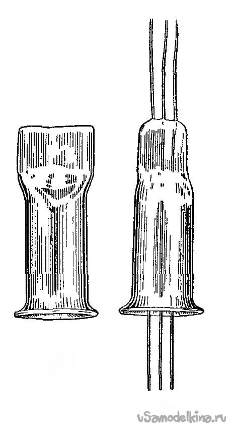 Рис. 4. Гребешковая ножка ЭВП. Веселовский С. Ф. «Стеклодувное дело». Москва, 1952 г. Стеклянная деталь и готовая ножка с впаянными выводами. Применяется как в радиолампах с октальным цоколем, так и в осветительных лампах накаливания, трубчатых люминесцентных и др.