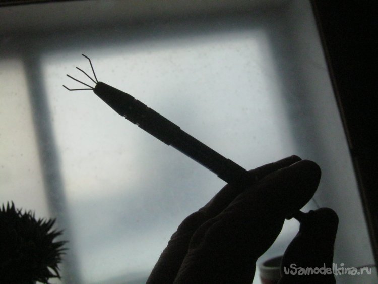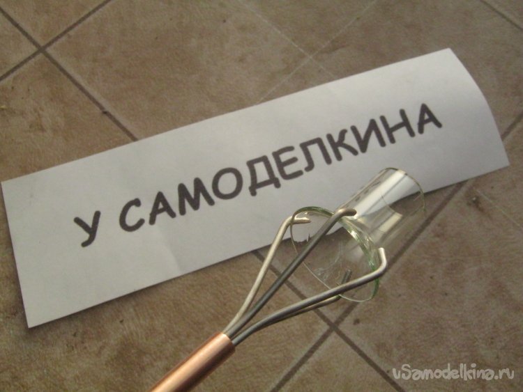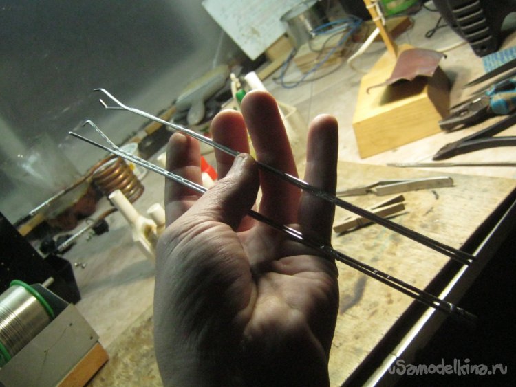 Фото 9. Сложил две спаянные пары крючков и вставил в трубку-ручку. Попробовал схватить стекляшку за воронку – ба! Работает и неплохо! Держит вполне уверенно, ослабляется цанга с конца – можно вытряхнуть горячее стекло, охладить водой железку и работать дальше.
