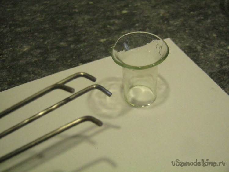 Для прочных длинных и нетолстых спиц применил нержавеющую сталь. Материал этот не слишком распространен в стеклянном приборостроении, зато часто используется в декоративном стеклоделии – пинцеты, щупы, иглы, крючки, ножницы. В основном, инструмент медицинский и для короткого контакта с размягченным стеклом – горячая нержавейка таки к нему липнет. Мединструмент как правило немассивный, техника работы им такова – рядом с горелкой стоит и стаканчик с водой. Как только пинцет или крючок начинает липнуть, или просто через некоторые промежутки времени, его ненадолго макают в воду и продолжают работать.