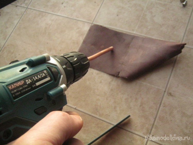 Фото 8. В качестве ручки-цанги зажима подобрал медную трубочку Ø6 мм. Старый вариант автомобильного (?) толка несколько более толстостенен. Современные кондиционерные трубочки облегченные, экономные, просвет имеют крупнее, четыре электродных проволочины Ø2 мм в нее аккуратнейшим образом помещаются с небольшим трением. Роликовым резаком отрезал недлинный, так чтобы удобно помещался в руке, но не более, кусочек. Круглым надфилем удалил внутренние сужения - следы резака, зажал в патроне шуруповерта, зачистил и отшлифовал ручку несколькими номерами наждачки.