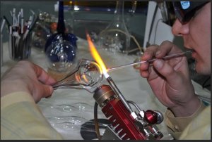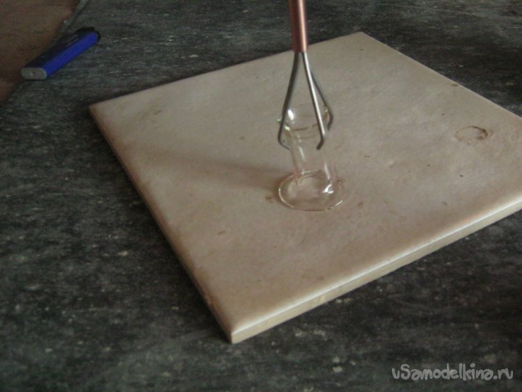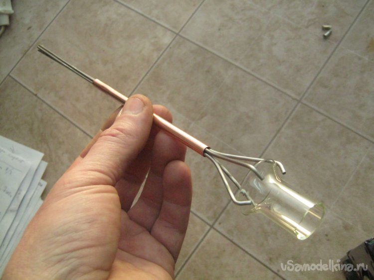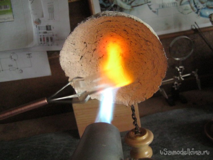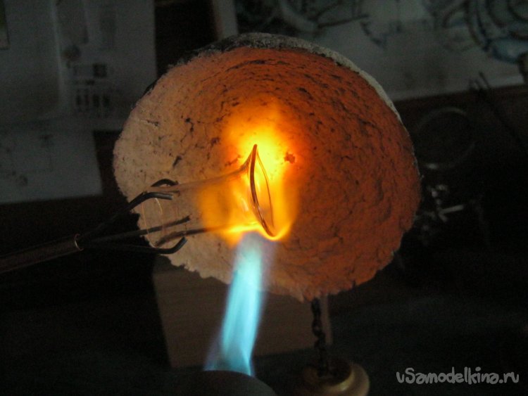 Такую стеклянную деталь при обработке в пламени придется непрерывно вращать и чем тоньше ручка зажима тем легче это делать. Деревянная ручка отпадает - слишком толсто. Однако, не будет ли металлический зажим жечь пальцы? – вопрос на который можно ответить только практически. В крайнем случае на медную трубку можно усадить несколько слоев термотрубки или надеть кусок силиконового шланга.