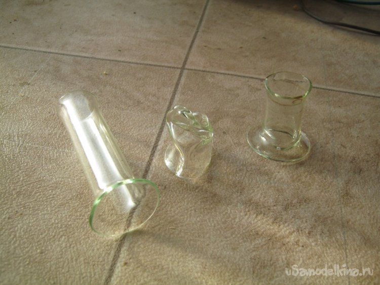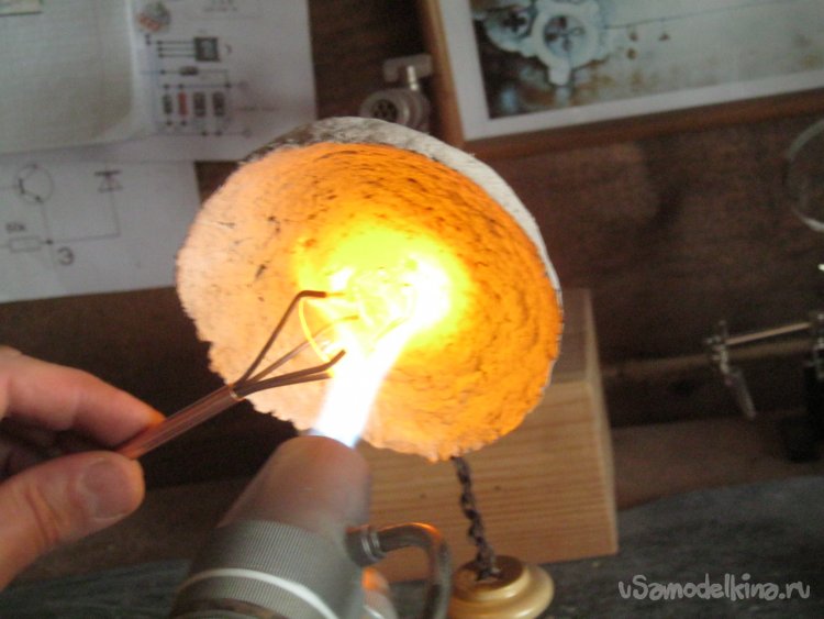 Фото 5. В качестве объекта для хватания сделал модель – отрезал кусок стеклянной трубки Ø18 мм, длиной около 200 мм. Постепенно разогрел в пламени стеклодувной горелки её конец до размягчения стекла и в два приема сформовал небольшой конус медной разверткой смазанной расплавленным воском. Укрыл деталь базальтовым одеялом для плавного остывания – условный отжиг, аналог классического прогрева «в светящемся коптящем пламени». Минут через 20 остывшую трубку можно доставать. Отрезал развернутый конец – чиркнул поперек трубки ребром треугольного алмазного надфиля короткую риску и приложил ее к накаленной нихромовой проволоке электрорезалки. Дождавшись негромкого «хруп!», повернул трубку. Проведя таким образом в три приема кольцевую трещину легко отломил деталь - заготовку гребешковой ножки лампы (на фото). На концах нержавеющих спиц плоскогубцами отогнул сообразные крючки-захваты.