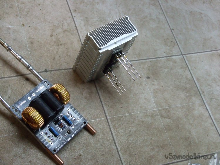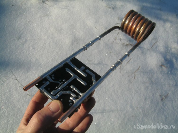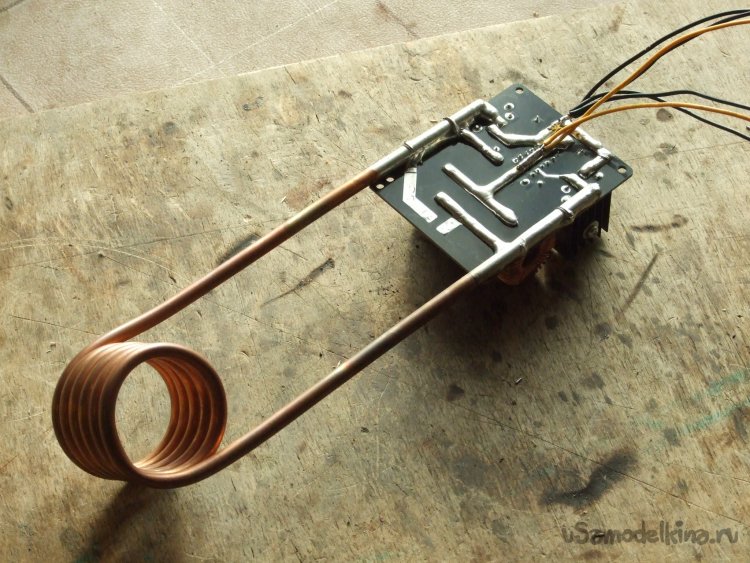 Фото 2. Фабричный модуль на полевых транзисторах снабдил самодельным лаконичным индуктором из медной трубки, убрал штатные винтовые клеммы для подключения индуктора и БП, наплавил на широкие дорожки валики припоя. Питание 12 В. Ток потребления 2…3.5 (?) А. Табельные радиаторы транзисторов справляются играючи, индуктор холодный. Разогрев стальных железок до ~300 ͦ С (синий цвет побежалости).