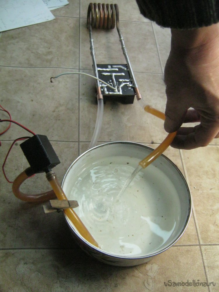 Фото 5. Проверка работоспособности водяного охлаждения индуктора, его герметичности. Циркуляционный микронасос – 12 В.