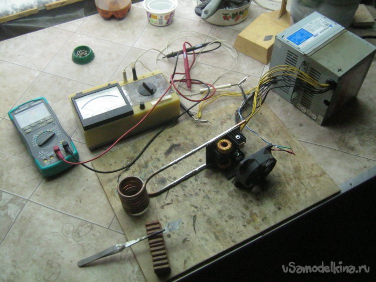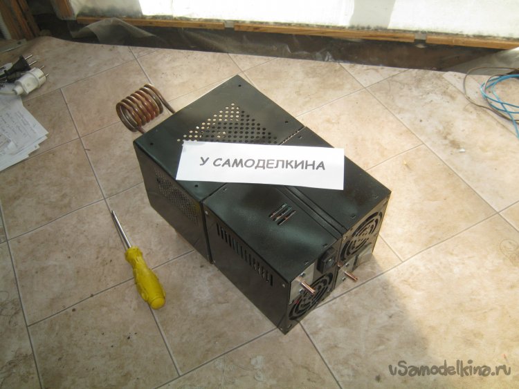 Фото 4. Применение для питания модуля - 24 В от двух последовательно включенных компьютерных БП (изолировать корпуса и заземление вилок, либо доработать). Нагрев небольшой стальной заготовки уже до красного каления за 8…10 сек. Ток потребления 2…5 (?) А, индуктор теплый, обдуваемые радиаторы нагреваются все еще терпимо.