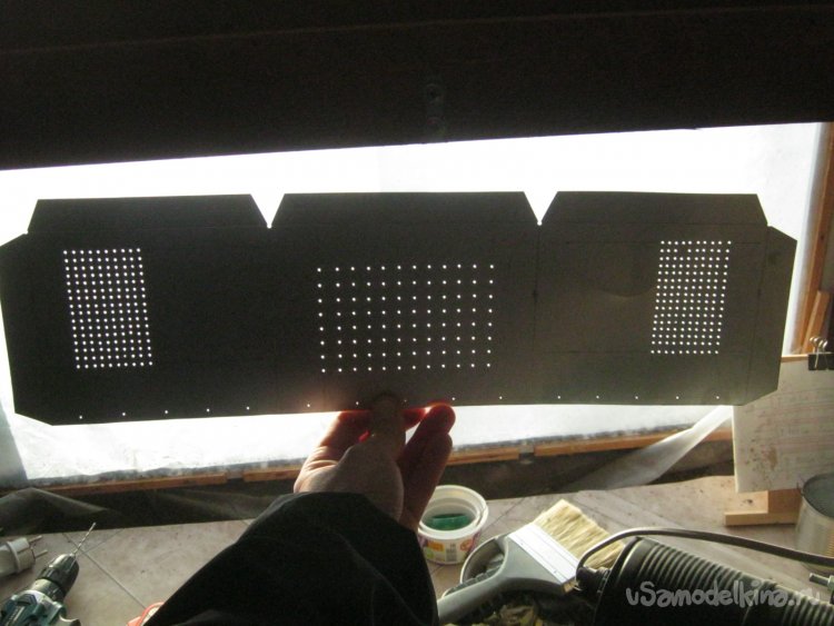 Фото 10. Развертку кожуха для ТВЧ платы разметил и вырезал ножницами по металлу из куска листа кровельной оцинкованной стали 0,45 мм. Не забыл и о лепестках-отгибах для удобного крепления к соседним панелям и модулям. Массивы отверстий разметил, накернил, просверлил нетолстым, рассверлил сверлом покрупнее. В углах просверлил по отверстию, чтобы при сгибании не было складок.