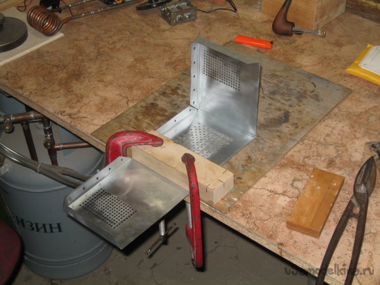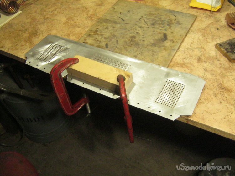 Фото 11. Гнутьё делал на краю рабочего стола зажав линию сгиба между двух твердых деревяшек с ровным краем. Гнул руками, также через недлинный брусок.