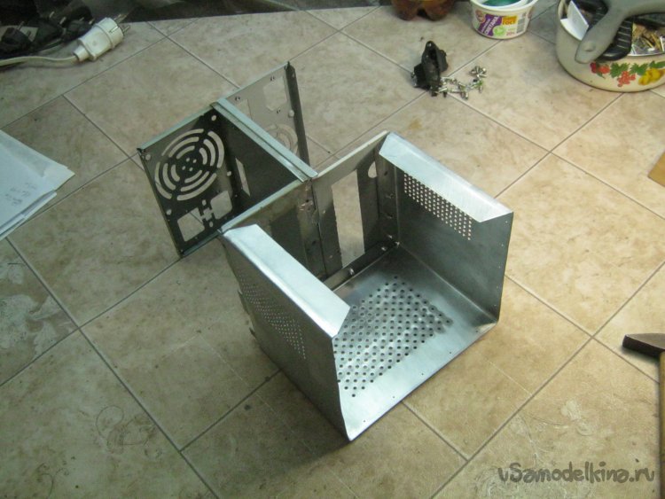Фото 13. Сборка шасси установки ТВЧ. Обе половинки корпусов БП приклёпаны и спаяны днищами, так, чтобы вытяжные заклепки не попадали под плату. Небольшой УШМ прорезал несколько окон для сообщения модулей между собой. Кожух ТВЧ модуля также приклепан. Верхняя стенка у него будет съемная, а передняя деревянная (изолятор).