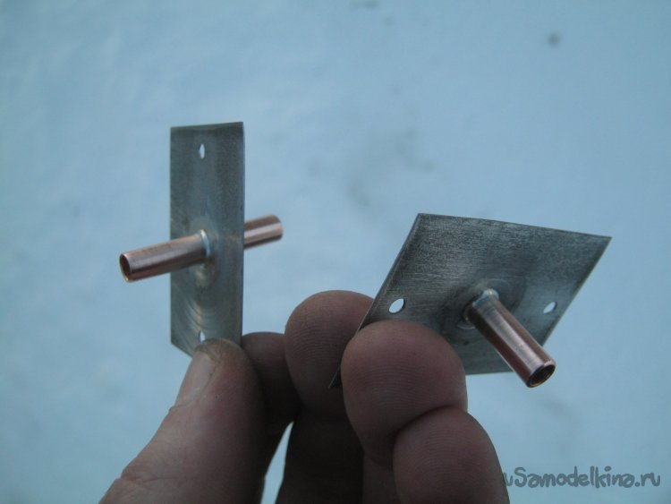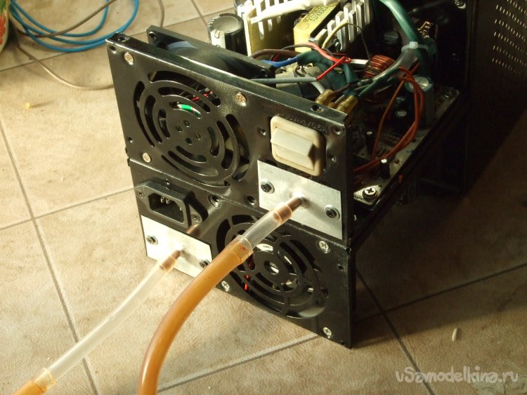 Фото 15. Силиконовые шланги водяного охлаждения индуктора пропущены через БП, в одном из них размещен и циркуляционный насосик. Выходные шланги следовало механически закрепить на задней стенке прибора. Сделал для этого пару промежуточных патрубков на небольших панельках. Они установлены в штатных окошках компьютерных БП вместо включателей или дополнительных розеток для включения монитора. Панельки из оцинкованной стали, вырезал ножницами по металлу. Отверстия для патрубка выпилил ювелирным лобзиком, впаял горелкой со специальной, для монтажа медных водопроводов, пастой-флюсом. Промыл теплой водой со старой зубной щеткой от остатков флюса.