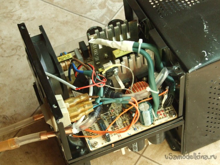 Фото 16. Установил доработанные платы БП, тщательно изолируя двумя слоями термотрубки проложил провода и жгуты, формовал их по месту, подогревая изоляцию строительным феном. На фото – монтаж внутри одного из БП. Прямой вывод шланга от индуктора, жгут «-» к ТВЧ, силовое низковольтное соединение со вторым БП. На задней стенке патрубок и сетевая розетка, на низковольтном радиаторе 7812 питает вентиляторы БП и транзисторов ТВЧ.
