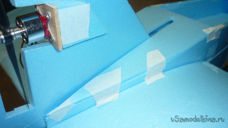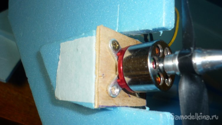 На бобышку вклеиваю кусочек 3 мм. фанеры, и на неё монтирую мотор с винтом.