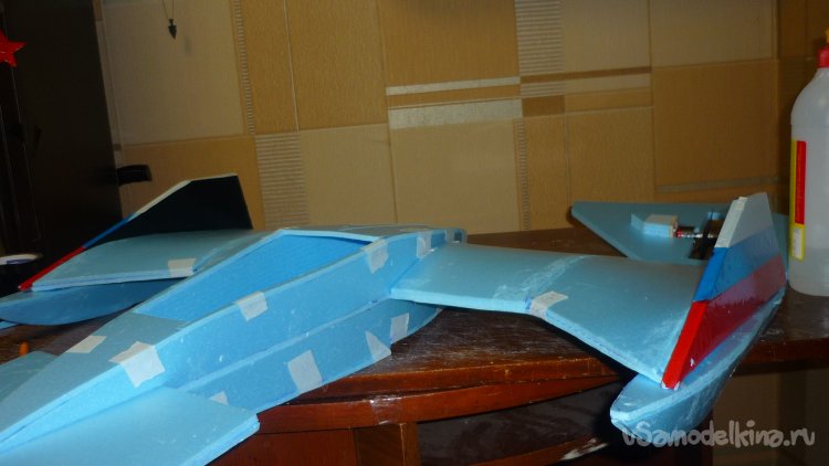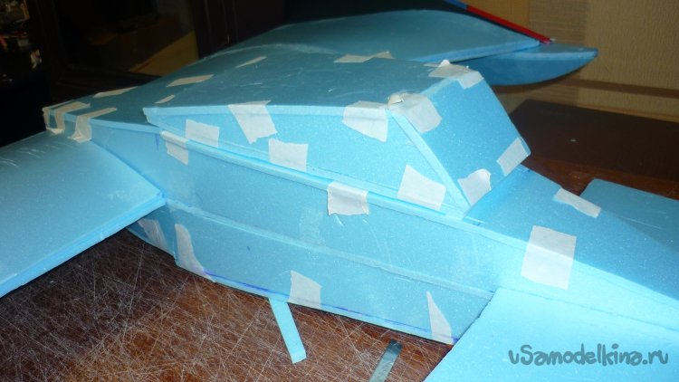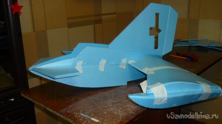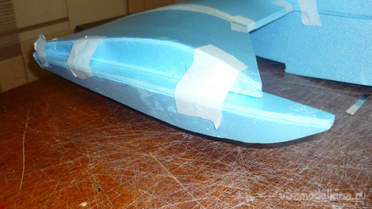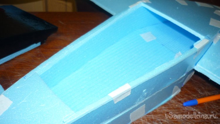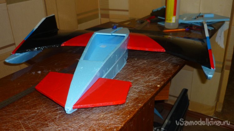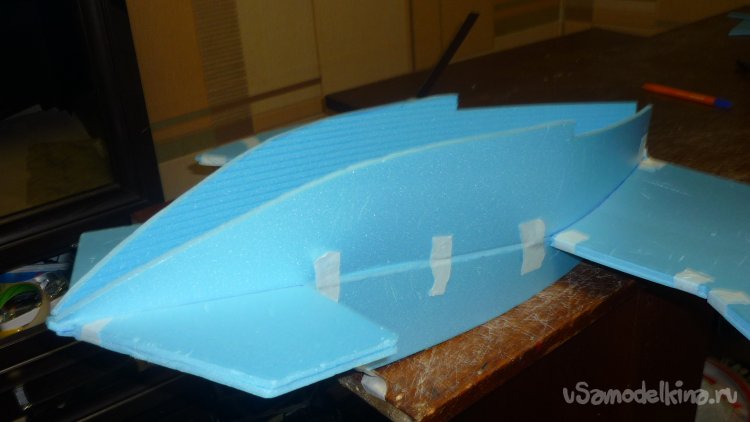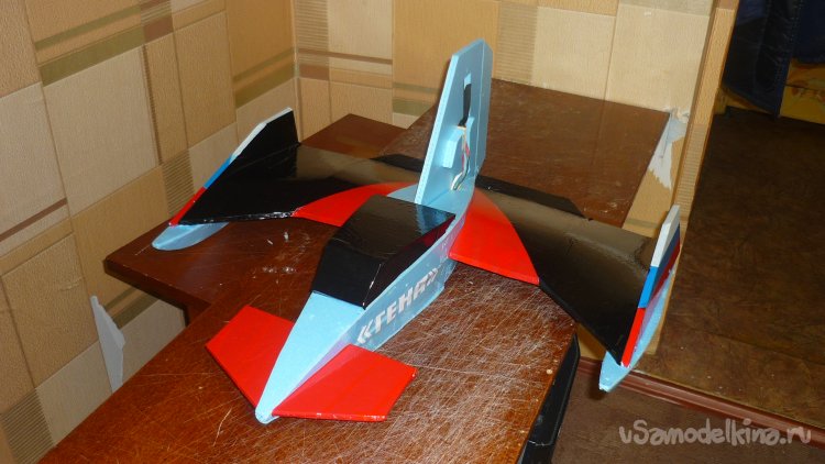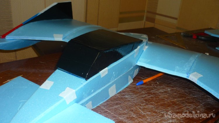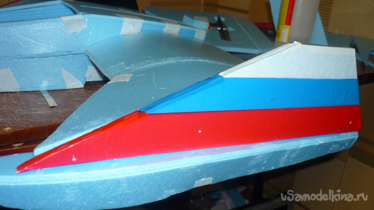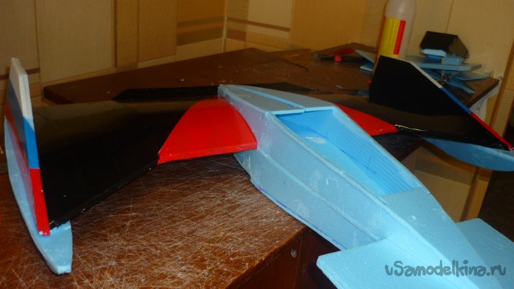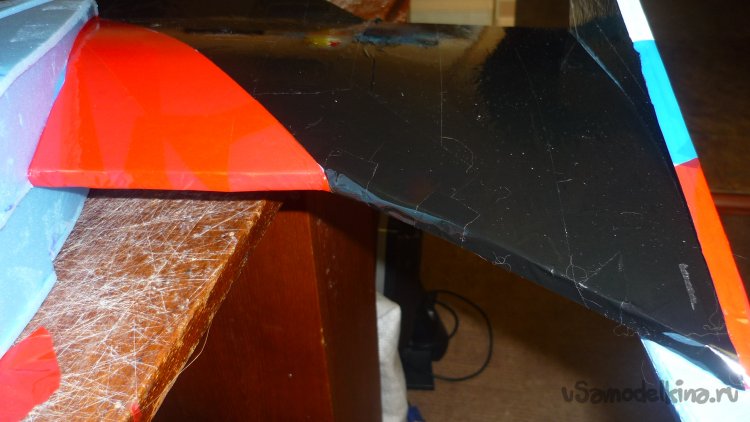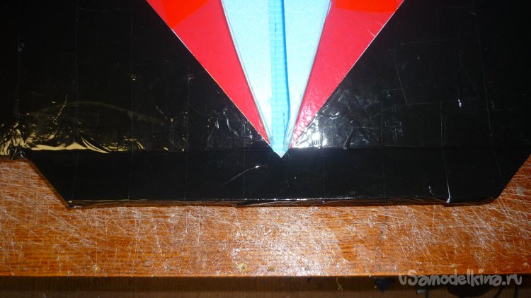 Заканчиваю обтяжку модели цветным скотчем, смонтировал киль.