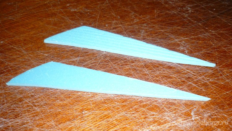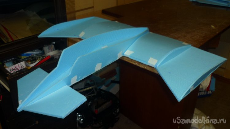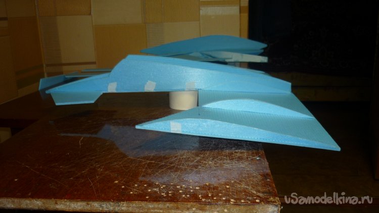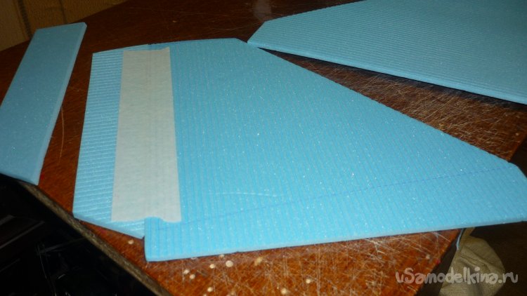 После долгих размышлений, решил смонтировать руль высоты. Вырезал заготовки и склеил в два слоя, навесил на бумажный, малярный скотч и обтянул чёрным скотчем.