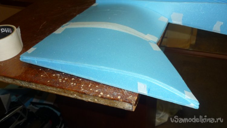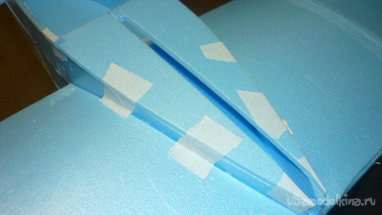 Перед склеиванием заготовок киля, вставляю полоску бумажного, малярного скотча и навешиваю одну боковину руля направления.
