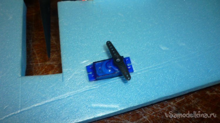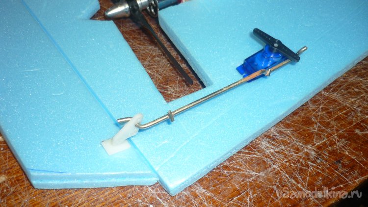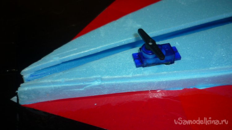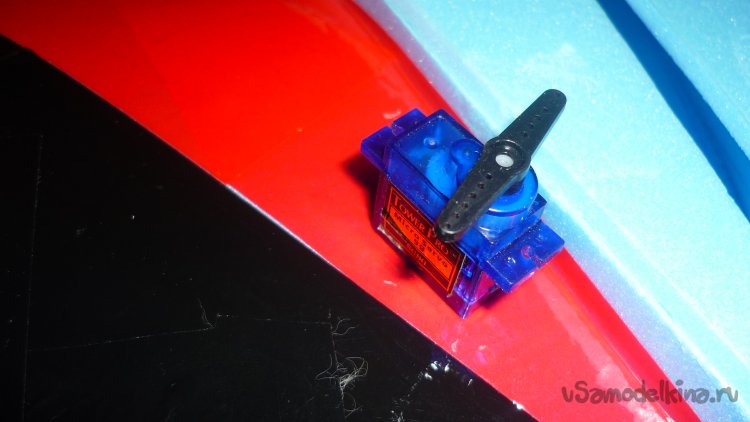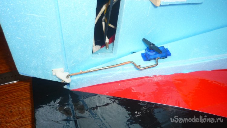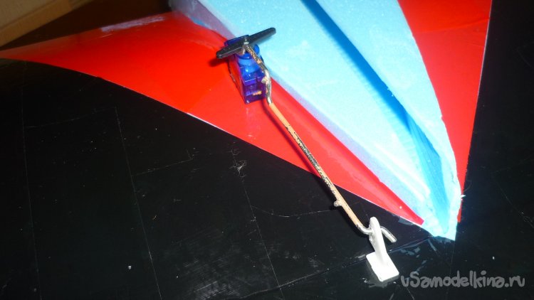 Разметил место установки сервомашинки управления рулём высоты, смонтировал, вклеил кабанчик, подсоединил тягу.