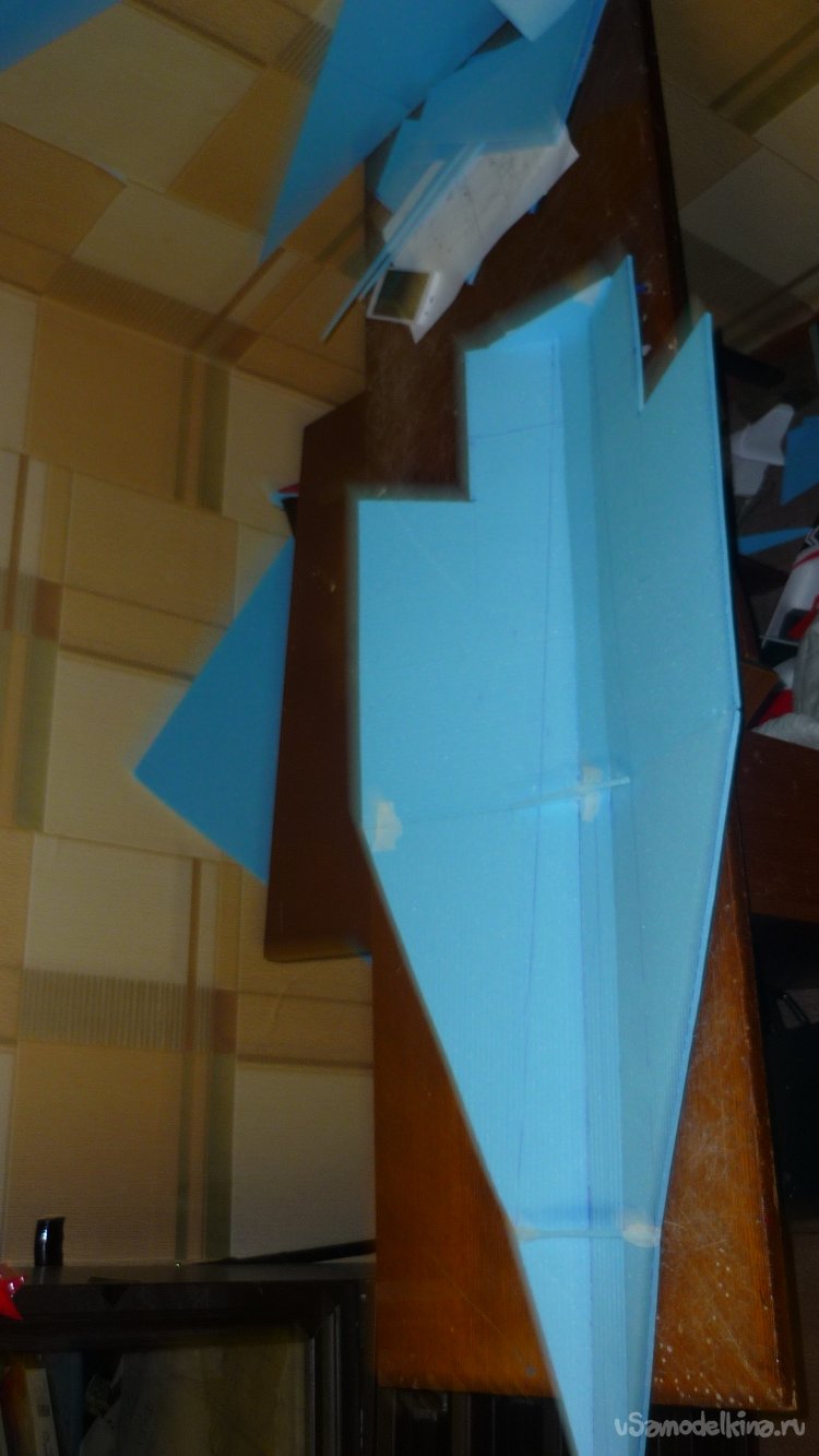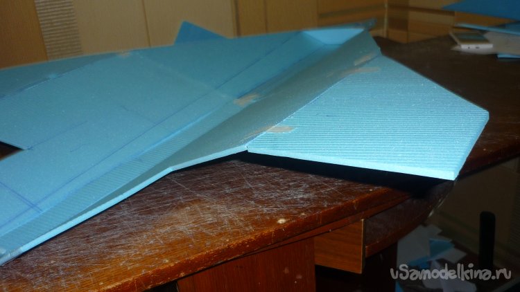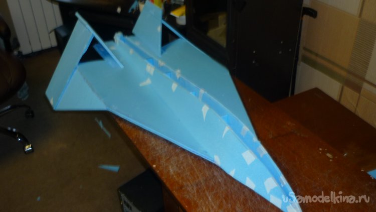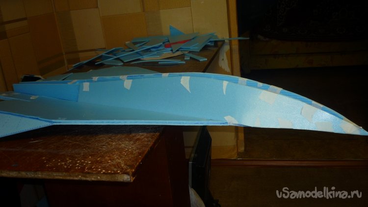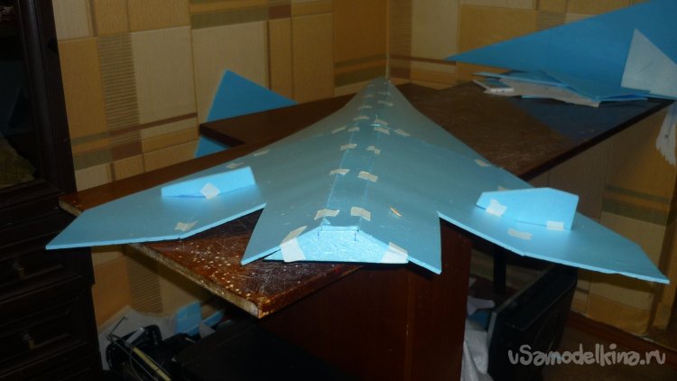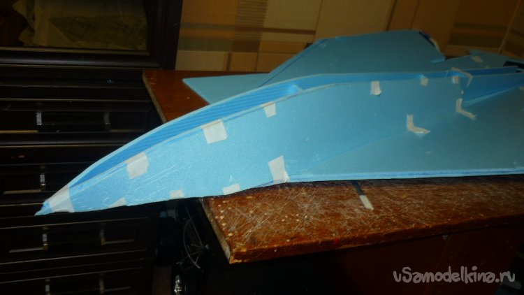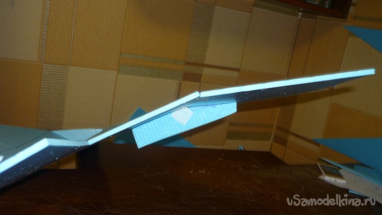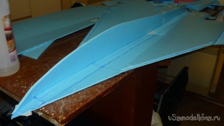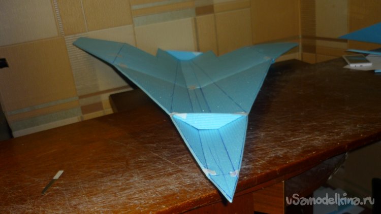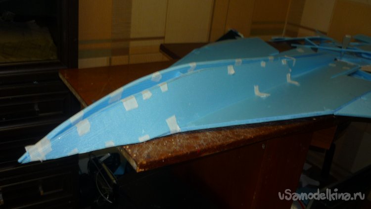 Нижние обшивки крыла приклеиваются к нижней стенке фюзеляжа под определённым углом, вырезал шаблоны и склеил носовую часть модели.