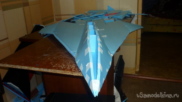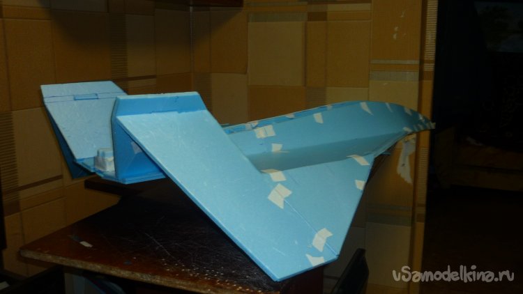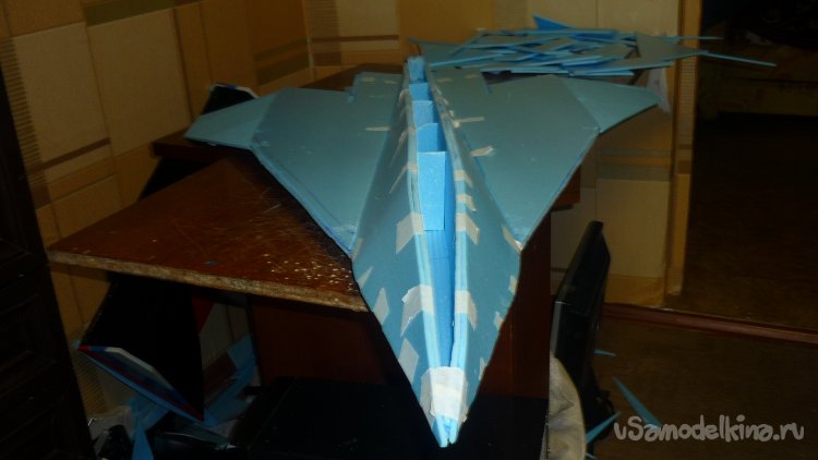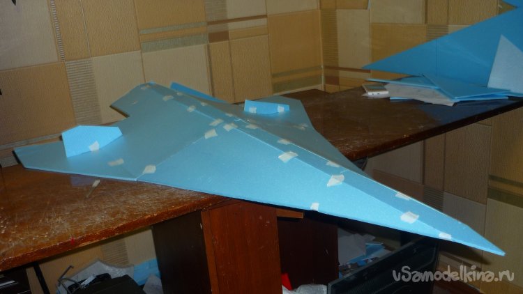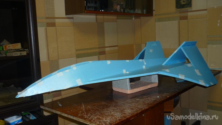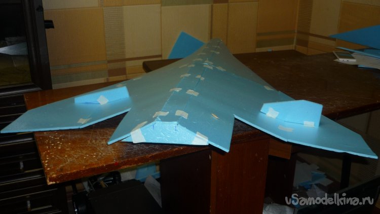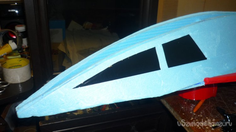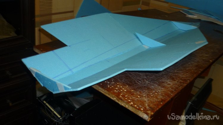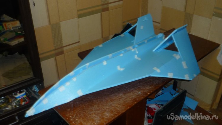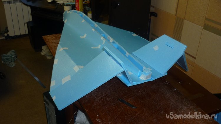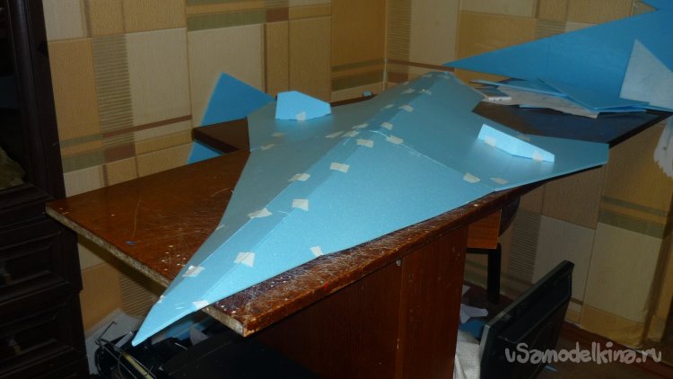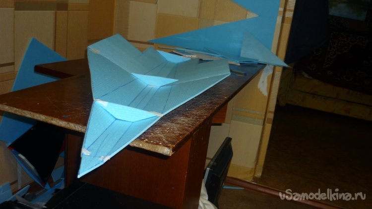 Нижние обшивки крыла приклеиваются к нижней стенке фюзеляжа под определённым углом, вырезал шаблоны и склеил носовую часть модели.