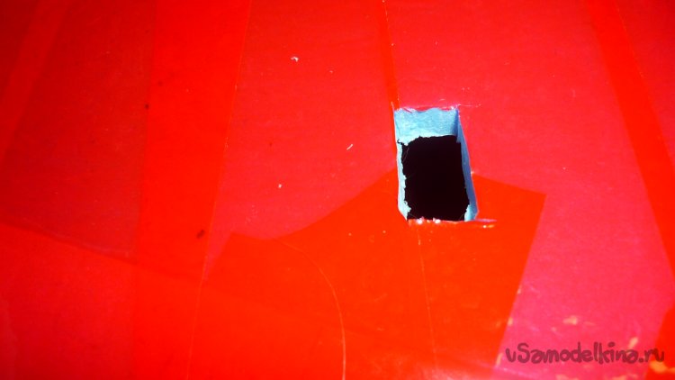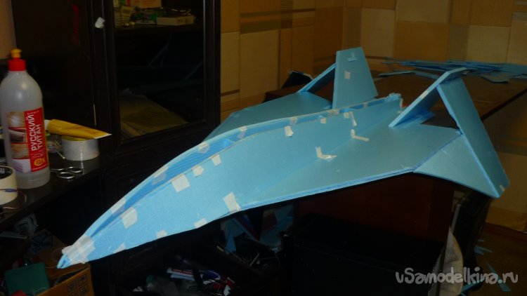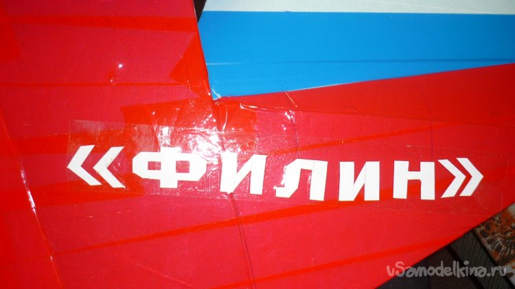 Начинаю локальную обтяжку модели цветным скотчем. Обозначил остекление кабины чёрным скотчем.