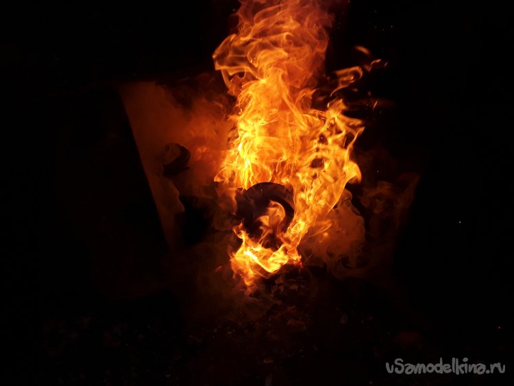 Следующий очень важный этап это закалка и отпуск металла. Так как я не знаю состав металла я решил сначала произвести стандартный способ закалки через масло. Если же метал не закалится произвести закалку с использованием соленой воды так точно все получится. Для того чтобы снять внутрянее напряжение металла при ковки произвожу нагрев до красного цвета всю поверхность топора потом оставляю на тлеющих углях остывать. После полного остывания произвожу основной нагрев для закалки, а это в районе 850гр и окунаю в подогретое масло. Ну вот и все закалка закончена теперь на наждаке обрабатываю все края и шлифую наждачной бумагой 80ед. Основные свойства закалки окончательно появятся после отпуска для этого в духовке нагреваю топор до 200гр в течение 2‑х часов и даю остыть не вытаскивая топор. При правильном отпуске металл должен стать соломенного цвета если же он станет темнее или вообще синим то значит нужно заново все перекаливать. Убедившись в своих правильных действиях можно смело считать закалку успешной. Для проверки металла после закалки я заточил под нужный угол лезвие, и разрубил гвоздь 2мм видимых следов на лезвие не обнаружено значит все действия привели к правильной закалке.