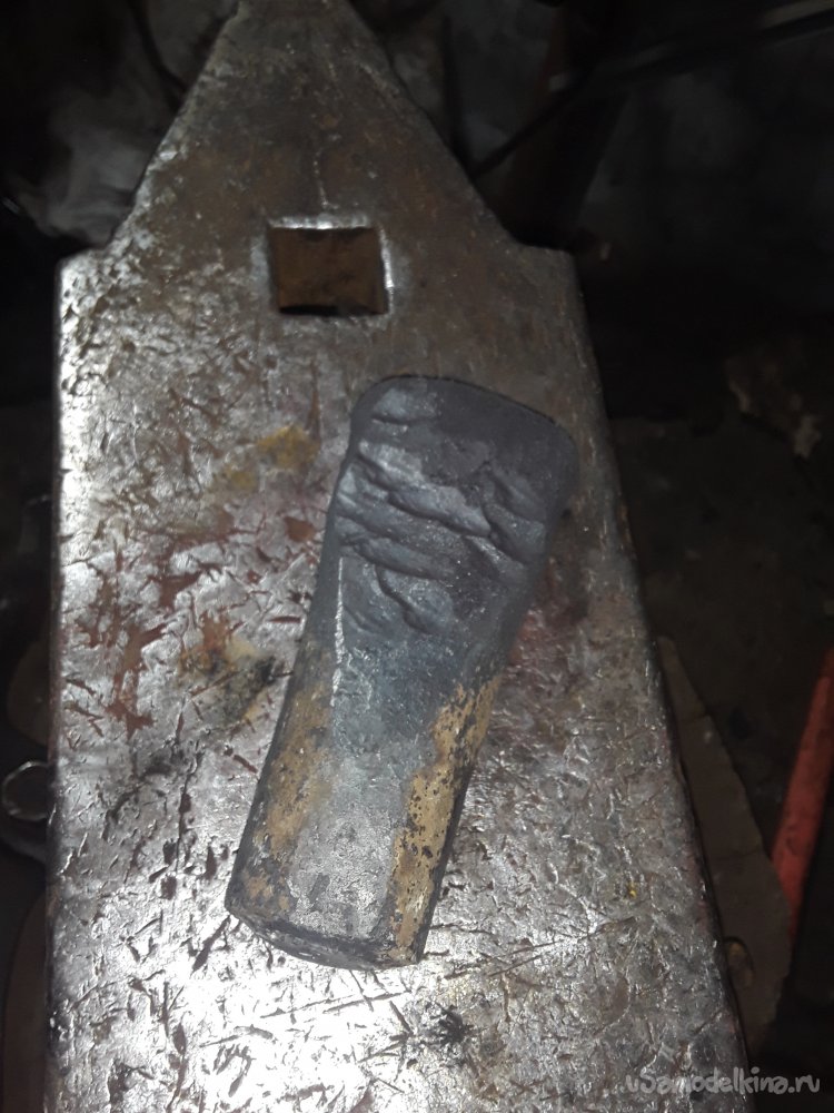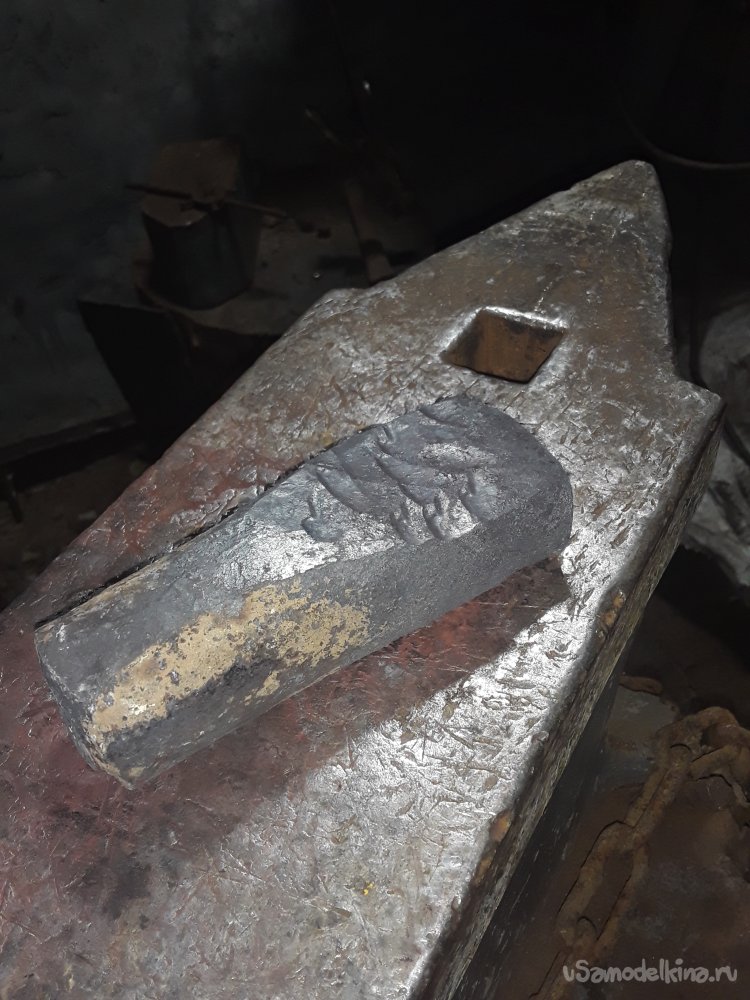 Время было 6 часов вечера я быстро покушал и побежал разжигать горн пока он выходил на рабочею температуру отрезал на всякий случай второй такой же кусок вдруг что-то пойдет не так. Обычно ковку топора начинают с прошивки отверстия под рукоять сначала малой прошивкой потом уже на конус. Я же особо не поверил в свои силы, но надежду не хоронил, решил сразу сначала отковать само лезвие, а уже потом прошивать. Нагрев заготовку я приступил к вытягиванию заготовку поочередно с обеих сторон удары наносил краем башмака молота весом 5кг. Спустя 10 минут маховой работы сил уже почти не осталось решить нагреть заготовку до большей температуры, а пока грелось заварить себе кофейку. Спустя 9 нагревов я все таки отковал лезвие топора до заготовки и поверив в то что, то получится пошел домой отдыхать до следующего вечера.