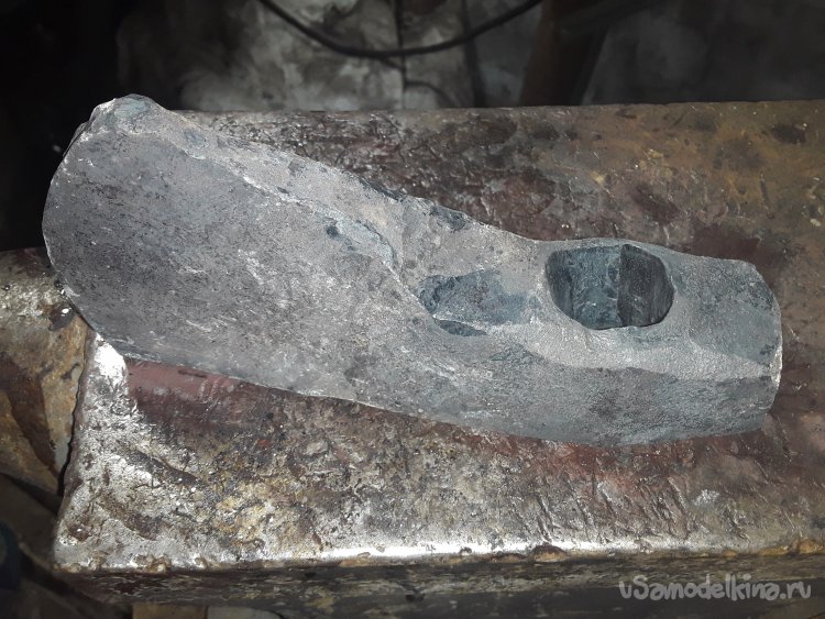 Для первоначальной прошивки отверстия у меня есть не знаю от куда, но вроде специальная штука для таких целей. Только диаметр у основания 13 мм, но для первой прошивки пойдет. Нагреваю и формирую место, где будет отверстие так, чтобы были примерно ровные стороны так как отверстие должно быть ровно по центру . После подготовки головы топора нагреваю как можно сильнее и пробиваю отверстие ровно по центру сначала до половины потом так же с другой стороны. Пока нагревается метать, нашел старое сломанное зубило и отковал из него пробойник с круглым телом диаметром 22мм. Перед прошивкой очень хорошо нагреваю места, а сам пробой охлаждаю в снегу так проще вытаскивать его из металла да и метал чтобы не перегревать так как метал может потерять свою закалку.