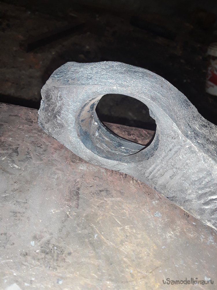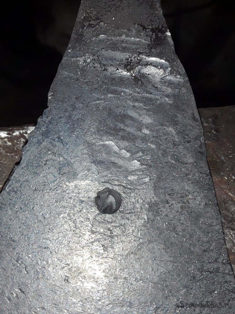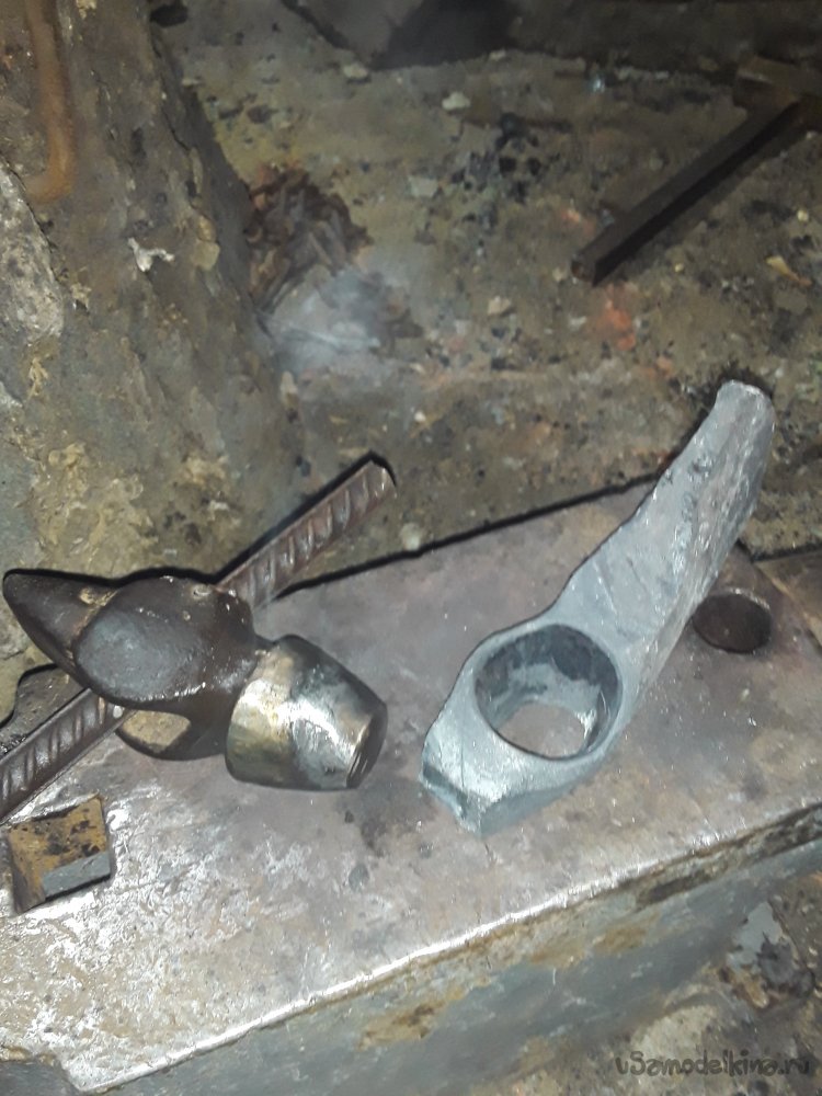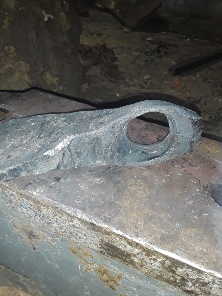 Теперь отверстие готово и нужно его прошить на конус пока греется метал я пошел искать чем прошивать. Самое подходящее, что нашел это молоток как раз под конус, но немного больше чем мне нужно. Болгаркой все подогнал до нужного размера и начал прошивать с наружней стороны. За 4 прогрева все от формировал и приступил к выравниванию обуха. Само отверстие получилось круглым на роге наковальни под углом вытягиваю отверстие в овал так как сверху заранее оставил 2см металла. После всех работ еще раз проверяю обух и где надо выравниваю.