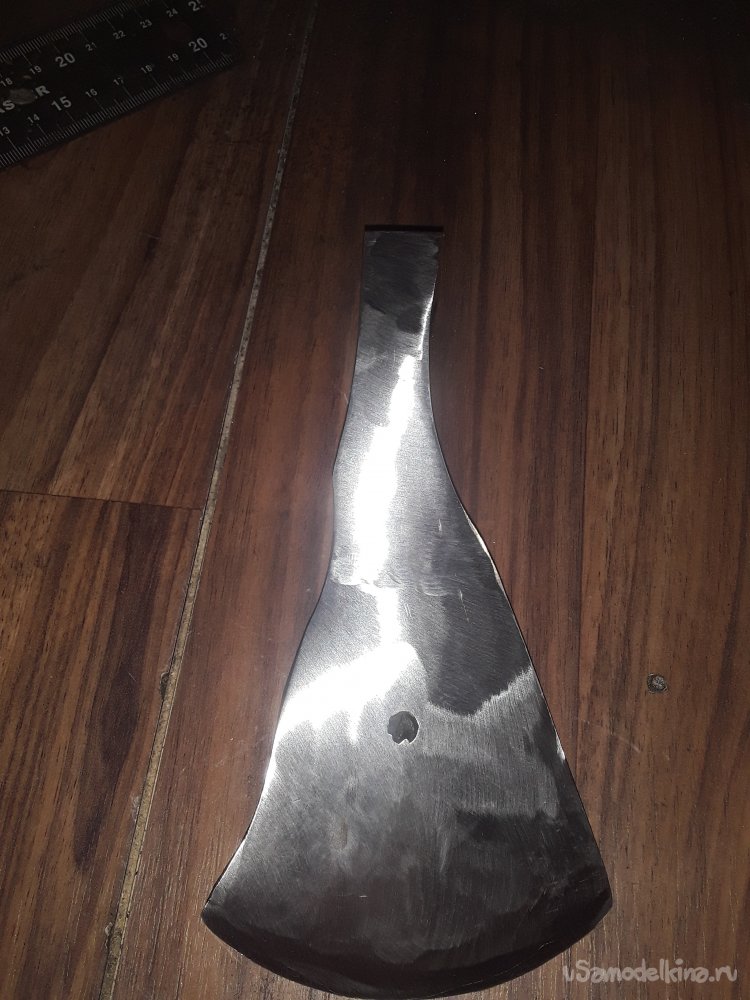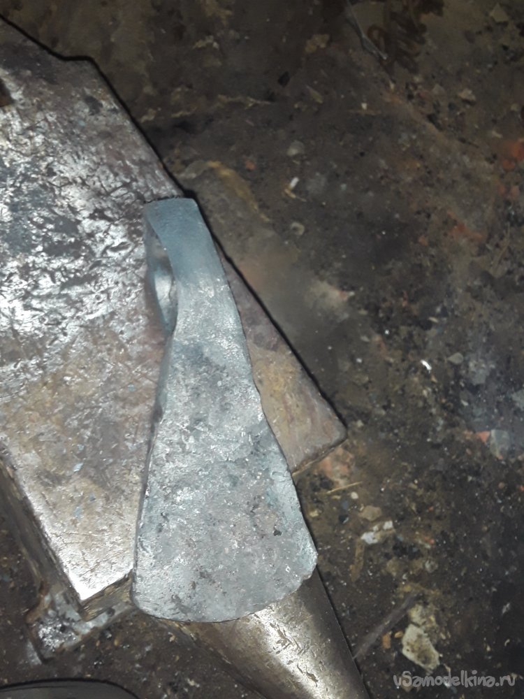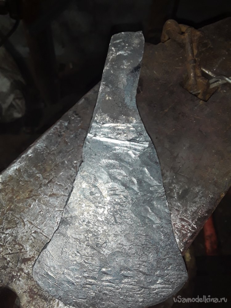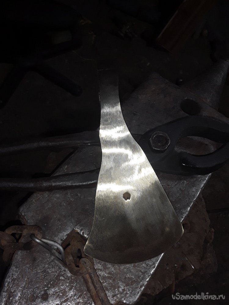 После того как обух принял нужную форму, и вид приступил к работе с лезвием. Косыми ударами молота оттягиваю лезвие в длинну от начала обуха примерно получилось 15см. Теперь разгоняю лезвие в ширину от центра к краям толщина возле обуха 1.5см потом сводится в острие. Толщена режущий кромки 3мм для того чтобы не перегреть при закалке так как метал толстый и лезвие быстрее нагреется чем обух и закалка будет не равномерной. Да и заточка топора не потерпит тонкой режущий кромки. После всех работ еще раз тщательно все проверяю чтобы все было красиво и ровно и самое главное чтобы прошитое отверстие было ровно по центру и после монтажа рукояти все было симметрично.