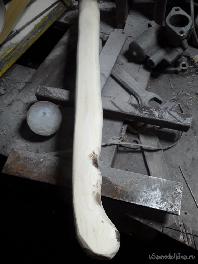 Ну вот и все с огнем все работы завершены осталось навести красоты. Болгаркой на малых оборотах лепестковым кругом с разным зерном шлифую все грубо, только чтобы придать нужную форму. После этого мелким зерном чередуя шлифую до исчезновения рисок на поверхности. Далее 1к зерном все обрабатываю в блеск и потом уже пастой гои номер 1, 2 довожу до блеска всю поверхность топора. Следующие, что нужно сделать это найти подходящей длинны и диаметра палку и выточить с нее рукоять. Для этого я взял кусок сухого карагача длинной 60см и снял с него кару. Для рукояти думаю карагач очень хорош мне он очень нравится да и крепкий. Ножом грубо снимаю все лишнее потом подгоняю под обух чтобы все сидело плотно. Далее на шлиф машинке формирую окончательную форму рукояти.