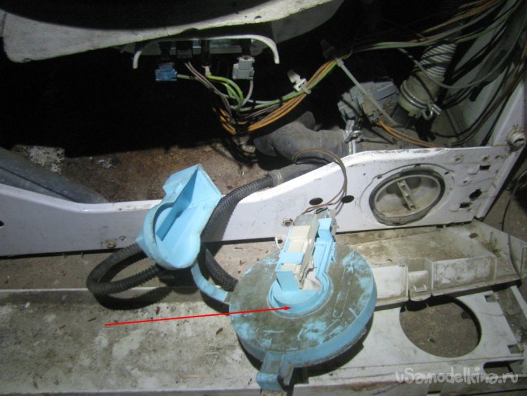 Последнее место, куда я полез со скептицизмом, это самое дно стиралки, тут находится помпа, я думал может там слетели какие-то контакты. Но проблема затаилась еще ниже, на само дне находится датчик затопления, он срабатывает, если что-то пошло не так и на пол налилось воды.