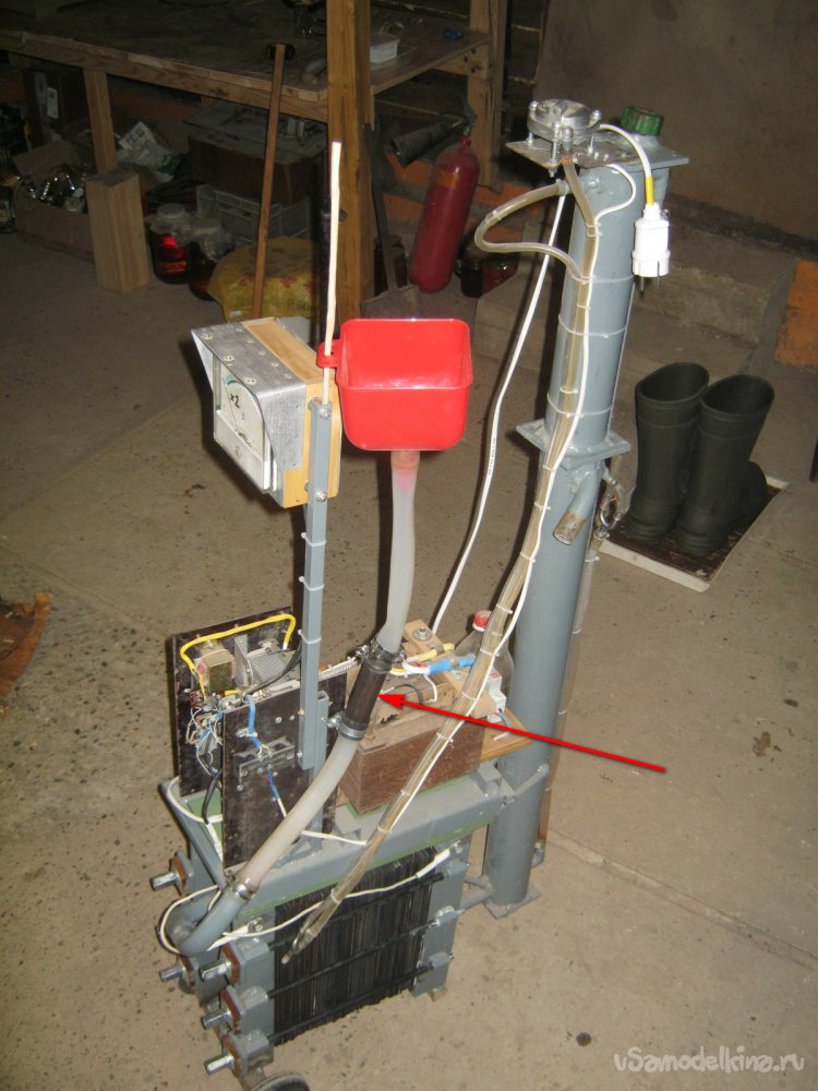 Фото 16. Собрал электролизер – установил на реактор деревянную площадку-изолятор, пристыковал и подключил БП и шланги. Шланг восходящего канала из-за утолщения набора пластин стал короток. Несколько удлинил его проставкой из куска стальной водопроводной трубы (отмечено). Этот временно отсоединенный шланг удобно использовать для первичной заправки реактора щелочью (на фото).