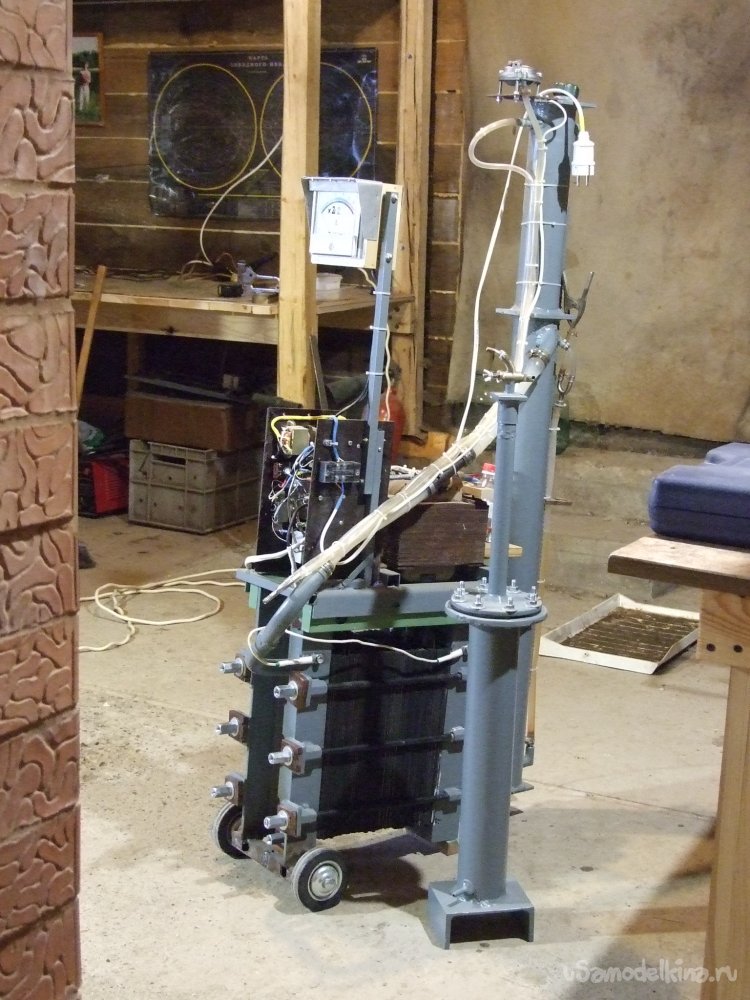 Отремонтированный и восстановленный аппарат сохраняет избыточное давление, по крайней мере, трое-четверо суток, воздух в систему не попадает (полезно для щелочи), аппарат быстро готов к работе. На каждой ячейке падает - 2.2 В при сетевом ~230 В. От сети электролизер потребляет 1 кВт, но можно настроить (концентрацией щелочи) больший ток в реакторе, при этом несколько снизится долговечность пластин, увеличится пенообразование.