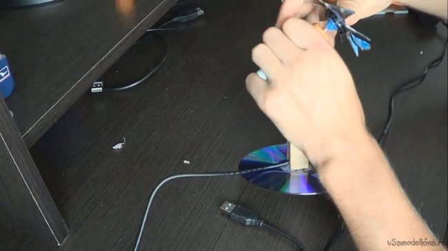 В углубление в деревянном бруске необходимо залить силиконовый клей, и туда укладываем плотно провод от USB шнура, а сам тюбик с моторчиком внутри приклеиваем к основанию бруска. А с другой стороны бруска приклеиваем CD диск на силиконовый клей.