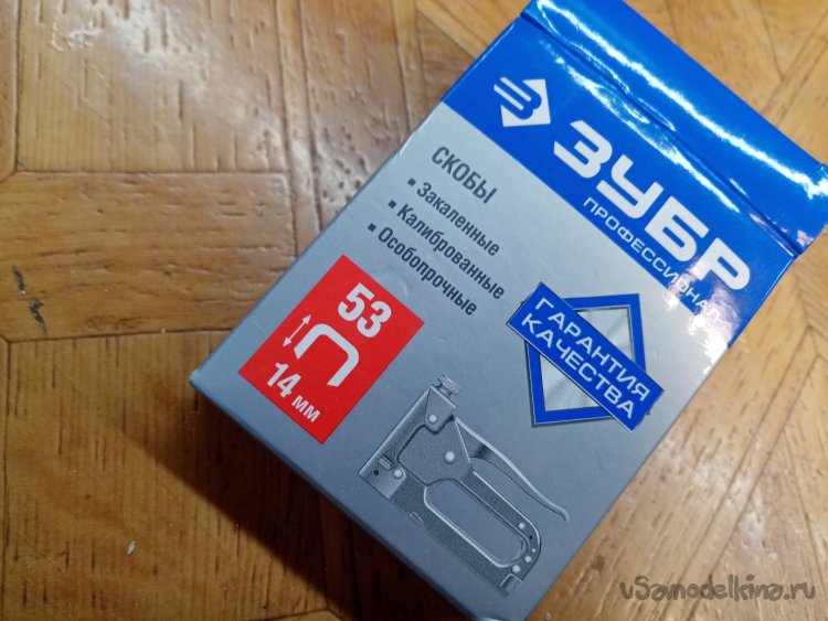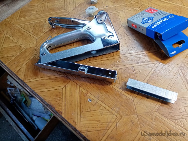 И так, в работу вступает забиватель скоб. Купил его достаточно давно, когда возникла необходимость в ремонте дивана. С этой работой справился, есть опыт. Поскольку обивочная ткань доставшаяся от дивана достаточно толстая прикупил длинных скоб на 14 миллиметров. Нужно пробивать в некоторых местах двойное сложение.
