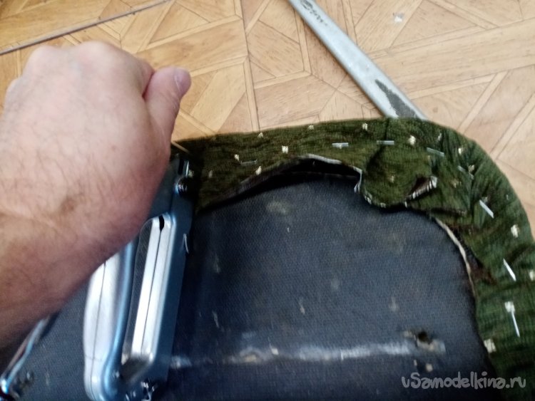 Вторая сторона спинки немного проще для обтяжки. Есть прямые участки. Подтягивая материал и закрепляя его скобами, прохожу прямой участок.