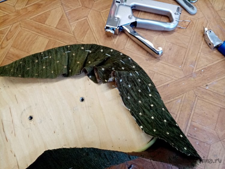 Обтяжка начинается с фиксации материала скобами по четырем сторонам. Сначала фиксирую одну сторону, затем подтягивая материал, прижимаю его край степлером. Достаточно неудобно, при ударе приходится надавливать другой рукой на степлер. Тогда скобы входят «по самые уши». После некоторого ковыряния приспособился и работа бодро пошла.