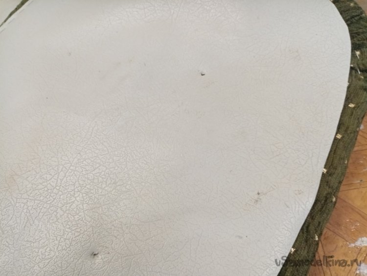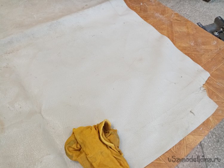 Нужно найти немного материала. Чтобы закрыть нижнюю сторону сиденья. Поскольку там не все красиво. Нашелся кусочек кожзама. Правда, немного пыльный. Не буду полностью его протирать. Нужный кусочек мокрой тряпочкой, немного пенного очистителя для «близира».