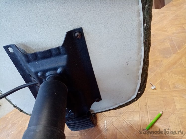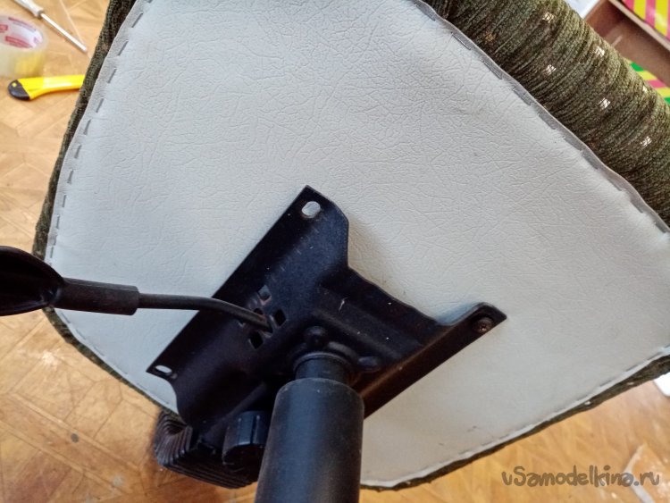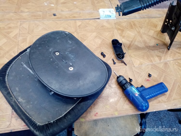 У меня осталось еще некоторое количество обивочной ткани от дивана. Принимаю решение обтянуть вымытый стул. Старую обшивку с «седушки» снимать не буду. Так мягче. В бой вступает мой старый друг, оригинальный шуруповерт «LJ» с битой под крест. Бодро раскручиваю стул. Снимаю спинку и седло.