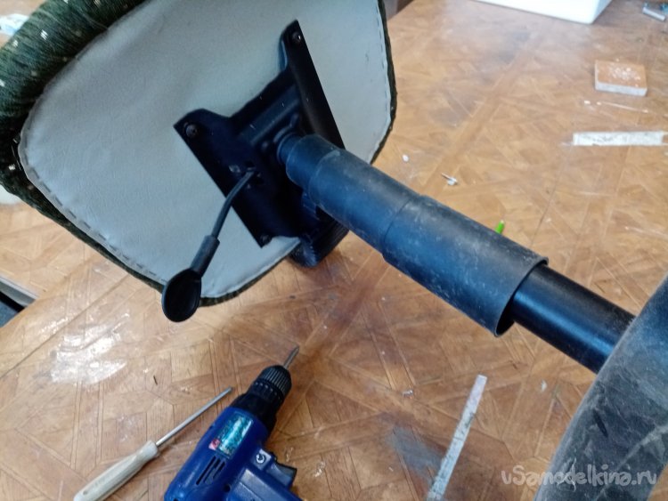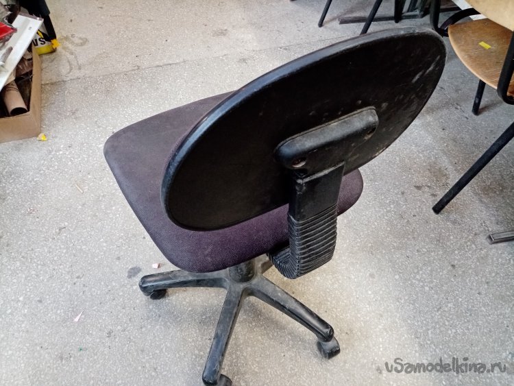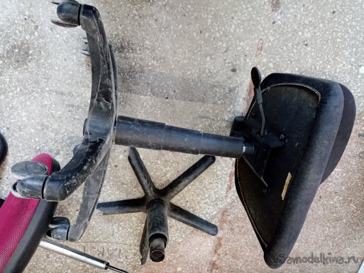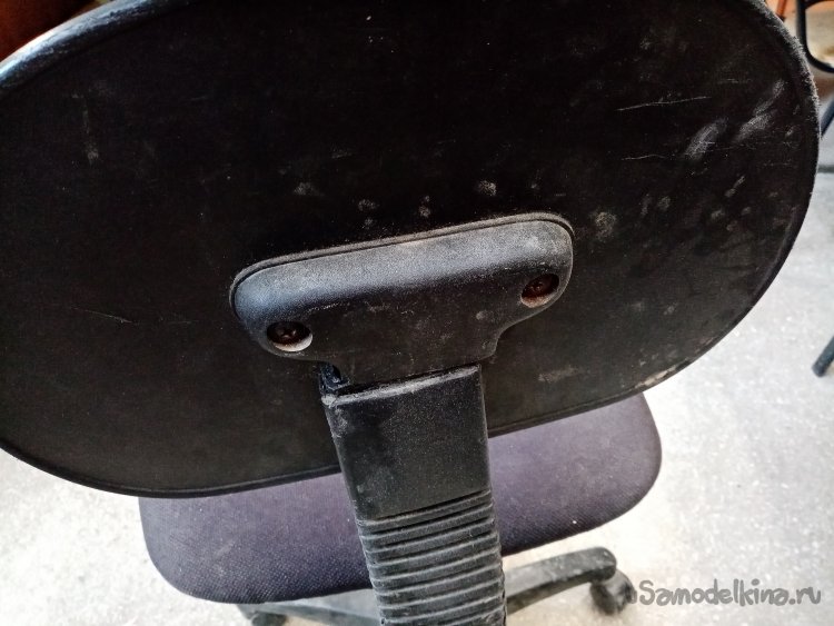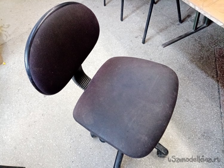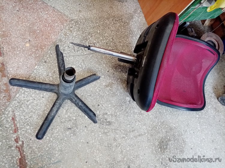 На работе идет постоянное обновление крайне необходимого оборудования. К нему относится и стулья. Одни ломаются от нагрузки или по «старости», приходится что-то изобретать. Так совершенно износился стул на колесиках под обозначением «офисный». Неоднократно ремонтированный и даже кое-где сваренный он закончил свою функцию окончательно. Нашел практически целый стул с небольшими дефектами в крестовине и колесиках. Немного грязный. Попытаюсь собрать из двух агрегатов. Один и желательно рабочий. Снимаю крестовину со старичка и пытаюсь установить на «найденыша». Размеры подошли идеально.