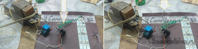 Подбором С1 и С2 устанавливаем ток через светодиоды 45…50 мА, это получается около 5 Вт полезной мощности. Вполне достаточно, проверено визуально в темноте. А для долговечности светодиодов режим использования по току всего на 50% - совсем неплохо. В процессе отладки схемы вспомнили про пульсации. Сфотографировал: с полной схемой - левые снимки, с откушенным С3 - правые. Осциллограф лень включать...