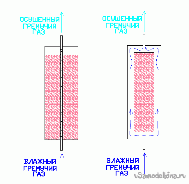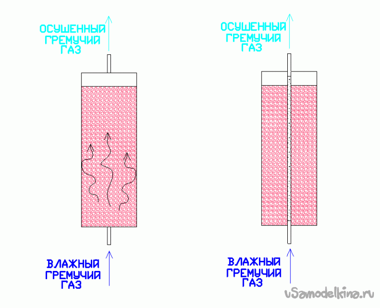 Рис. 2. Схема обычного осушителя (слева) и предложенная Ю. Н. Бондаренко, с ограниченной степенью осушения (справа), показаны на рисунке. В частичном осушителе газ проходит через перфорированную трубку окруженную засыпкой из силикагеля. Гидравлическое сопротивление трубки много меньше чем у слоя гранул и практически весь поток проходит через нее. Тем не менее, гигроскопическое окружение связывает некоторую часть паров воды из проходящего газа. Степень осушения можно подобрать количеством и диаметром отверстий в перфорации.