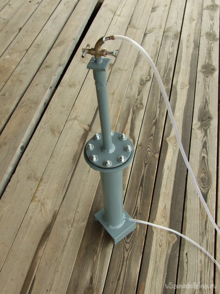 Фото 3. Мой осушитель, а это нижняя широкая часть, снабжен на макушке сухим фильтром – верхняя часть потоньше. Короткий входной штуцер вварен внизу глубокой узкой шахты (Фото 5) и добраться до него сложно. Здесь, применил зеркальный вариант частичного осушения (Рис. 2) – газ будет омывать извлекаемый перфорированный осушительный патрон. Вариант получился вполне удобный во многих отношениях, настраивать степень осушения в нем легче легкого.