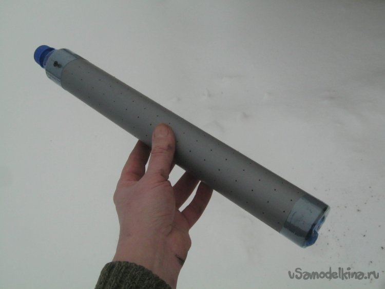 Фото 6. Пластиковый осушительный патрон в сборе. На боках трубки разметил и просверлил ряды некрупных отверстий и острым ножом срезал пластиковые заусенцы. ПЭТ бутылка с нетолстыми стенками натурально работает как термоусадочная трубка и обдувая половинки строительным феном на второй передаче, плотно усадил их на торцы патрона. Нижнюю часть удерживающую столб гранул дополнительно закрепил двумя недлинными саморезами.