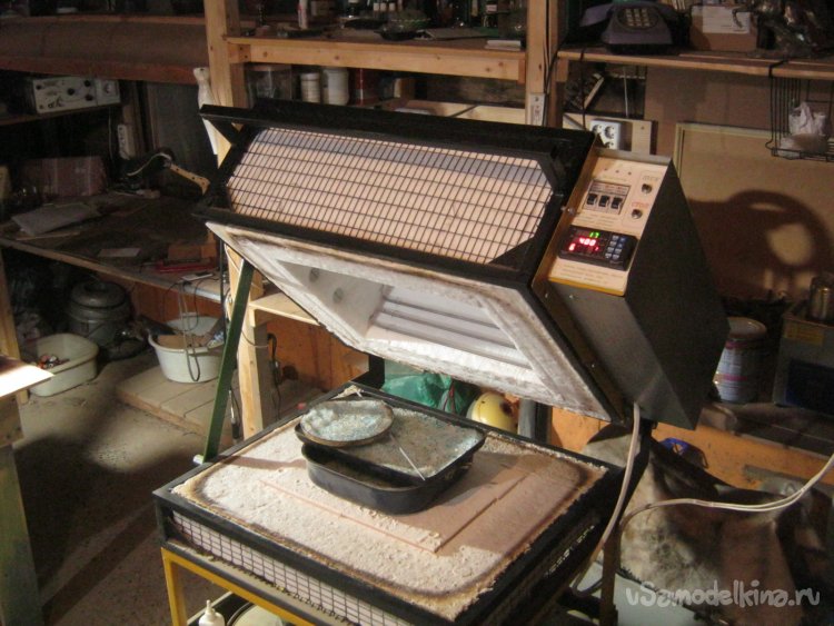 Фото 8. Просушка силикагеля перед снаряжением аппарата. Операция в принципе лишняя – индикаторные гранулы девственно голубые (при увлажнении они становятся розовыми). Тем не менее, работа была проделана для тренировки. Силикагель засыпал нетолстым слоем 1…1,5 см толщиной в стопку металлических лоточков и поместил в самодельную электропечь. Настроил термоконтроллер на 180 ̊ С и четыре часа работы. Вынул после охлаждения до 60 ̊ С.