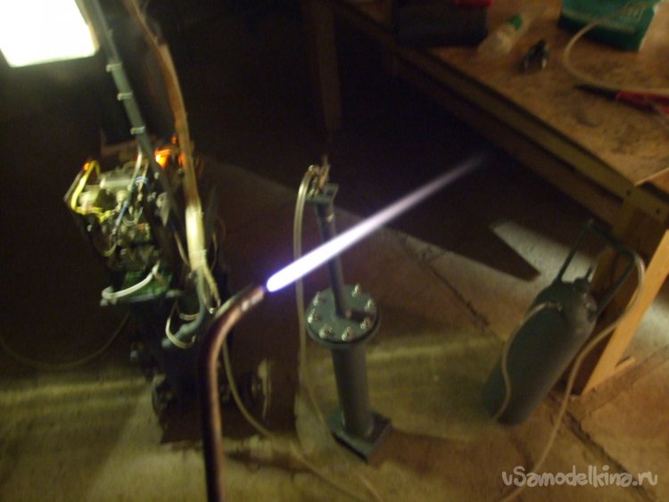 Фото 10. Кислород-водородный факел почти прозрачен, а окраску ему придают примеси. Обычно это оранжевый цвет натрия из щелочи электролита. Она пробирается через две промывалки и окрашивает пламя, а также регулярно кристаллизируется в микросоплах горелок. Здесь эти кристаллы отфильтровываются набивкой из базальтовой ваты в сухом фильтре (тонкая часть осушителя) и не столь заметны. Большую часть факела теперь практически не видно, только изредка вылетает частичка щелочи и проявляет этакий луч. Отчасти факел можно увидеть при сильном затемнении в движении. В целом, это тонкая игла длиной 30…35 см.