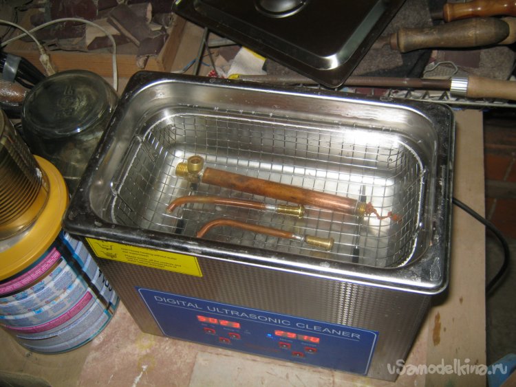 Фото 11. Горелку работавшую до этого счастливого дня без фильтров, пользуясь случаем тоже почистил и чуток доработал. Разобрал, насосал внутрь воды и устроил длительную промывку в ультразвуковой мойке. В чистой теплой воде. В медной ручке огнепреградитеьная набивка. Очень плотная, из тонкой отожженной медной путанки. Рядом два сменных наконечника с разными соплами.