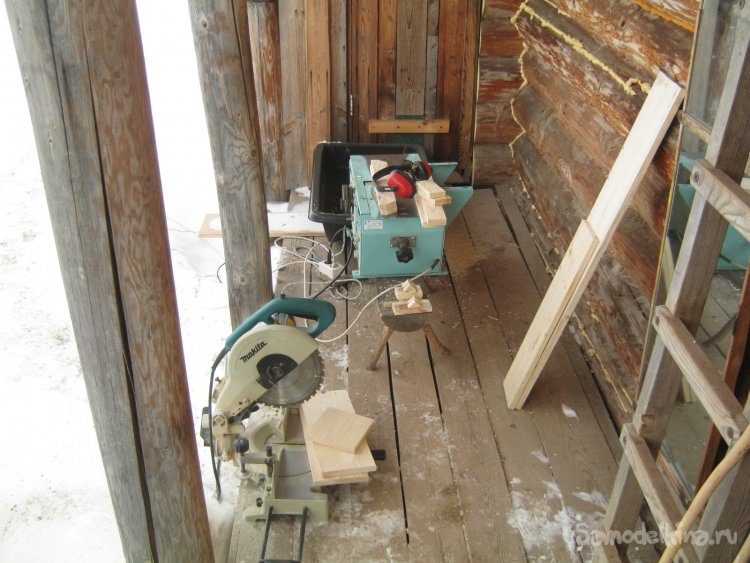 Фото 13. Еще одну проблему – нестояние без подпорки водяного затвора с полукруглым баллонным дном, нейтрализовал пользуясь короткой оттепелью. Подобрал заготовки из старых хвойных дощечек, прострогал, отпилил.