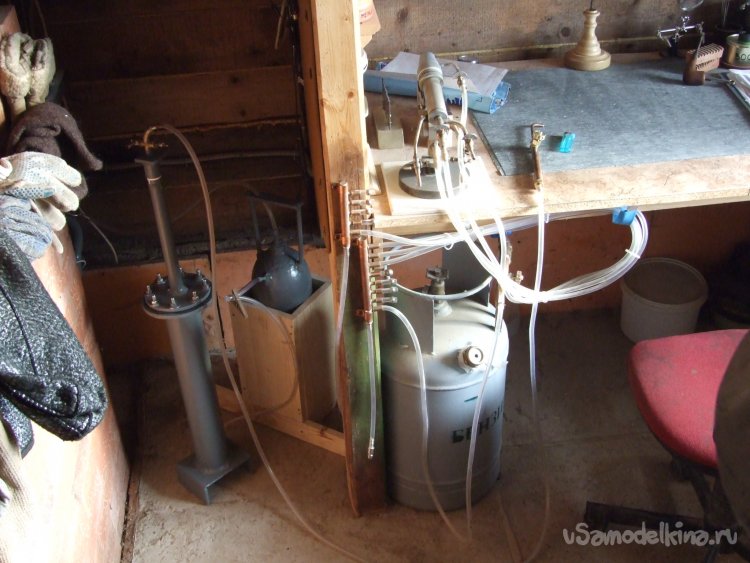 Фото 15. Разобрал угол от хлама и перенес-перевёз в него тяжелые аппараты. Восстановил соединения. Всё электролизное оборудование с комфортом разместилось сбоку от рабочего стола с настольной стеклодувной горелкой и вытяжкой. На фото видны водяной затвор и осушитель, сам реактор с блоком питания рядом, в узкой щели за кирпичной печкой. Там же и удобная розетка. В кадре также бензиновый карбюратор для получения по месту горючего газа.