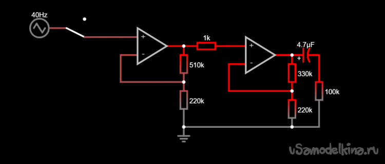 Схема из себя представляет не инвертирующий двух-каскадный усилитель, первый каскад по формуле R1/R2=Vk=510 000Ом/220 000Ом=2.31Раза, потом сигнал поступает на второй каскад где уже в 330 000Ом/220 000Ом= 1.5Раза.В итоге общие усиление 2.31+1.5= 3.81Раза.